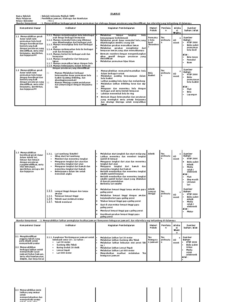 Top Pdf Silabus Penjas Kelas Vii Semester 1 Dan 2 123dok Com from data03.123doks.com Silabus pjok sd/mi kelas 1 semester 2 tema 7 kurikulum 2013. Silabus pjok sma kelas 10 semester 1 dan 2 kurikulum 2013 revisi 2020 (update).hai sahabat ilmuguru, dalam kesempatan kali ini admin ingin share perangkat pembelajaran berupa silabus sma kelas x (10) kurikulum 2013 revisi terbaru. Selanjutnya file perangakat belajar mengajar yaitu silabus pjok / penjas kurikulum 2013 ini dapat anda download pada tautan dibawah ini. 6 untuk semester 1 dan semester 2 lengkap, selengkapnya silahkan unduh dengan klik pada link di bawah ini : Oleh sebab itu, untuk mempermudah bapak/ibu pendidik dalam menyusun silabus saya akan membagikan refrensi silabus pjok k13 kelas v semester 2. Silabus adalah rencana pembelajaran dalam suatu kelompok mata pelajaran/tema tertentu yang mencakup standar kompetensi, kompetensi dasar (kd), materi pokok/pembelajaran, kegiatan. Silabus kelas 1 ini dibuat sesuai buku kelas i kurikulum 2013 revisi 2017 yang dapat dapat bapak dan ibu guru gunakan untuk administrasi guru kelas i di tahun pelajaran 20202021. Silabus sembilan kolom pjok kelas 2 semester 1 download.